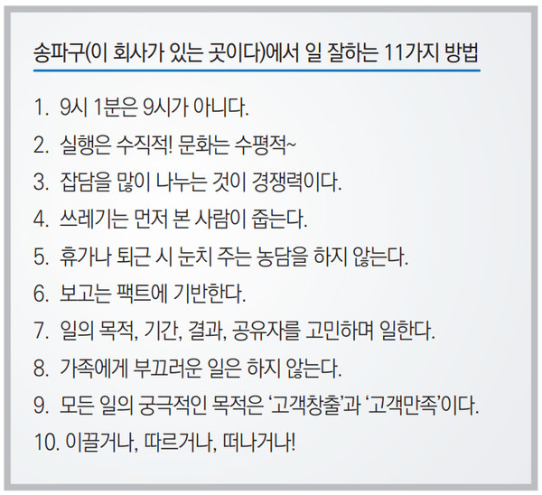 ”정말 요즘은 재미있고 즐거운 분위기가 전부인 것 같다. 아래의 문구는 어느 유명기업의 직원 행동 지침서다. 일종의 사훈 같은 것으로 그 회사의 정문 현관에 액자화 되어 크게 걸려있다.
