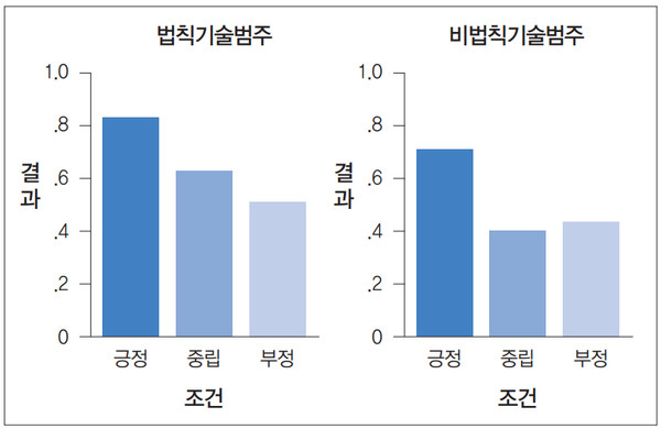 실험결과 예상대로 사전에 즐거운 음악과 긍정적인 내용의 동영상을 접한 참가자들(A그룹)이 다른 그룹의 참가자들보다 월등한 성적을 냈다. 즐겁고 긍정적인 분위기가 형성될 경우 법칙기술범주(RD)의 상황이든 비법칙기술범주(non-RD)의 상황이든 과제를 보다 수월하게 수행할 수 있음을 보여주는 결과를 보여주었다. 흥미로운 것은 비범칙기술범주의 상황에서는 우울한 무드의 그룹(C그룹)과 중립적인 무드의 그룹(B그룹)의 성적이 거의 비슷했다는 점이었다. 이는 일정한 패턴이 없는 상황에서는 중간과 우울함 사이에는 별 차이가 없음을 의미한다.
