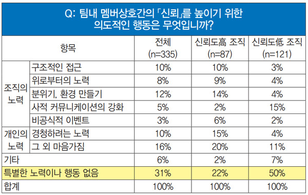 위의 도표는 신뢰도가 높은 조직과 신뢰도가 낮은 조직의 ‘조직신뢰도에 영향을 미치는 요소’에 대해 설문조사한 결과다. 전체 335명의 표준집단을 선발해서 물어본 것인데, 조직신뢰가 높은 조직일수록 조직차원의 의도적인 노력을 많이 하는 것으로 파악되었다. 신뢰도가 높은 조직이 신뢰도가 낮은 조직에 비해 2배더 의도적인 노력을 하고 있다고 답했다. 내부 분위기의 향상을 위해서는 조직차원의 의도적인 노력이 필요하다는 점을 알 수가 있다.