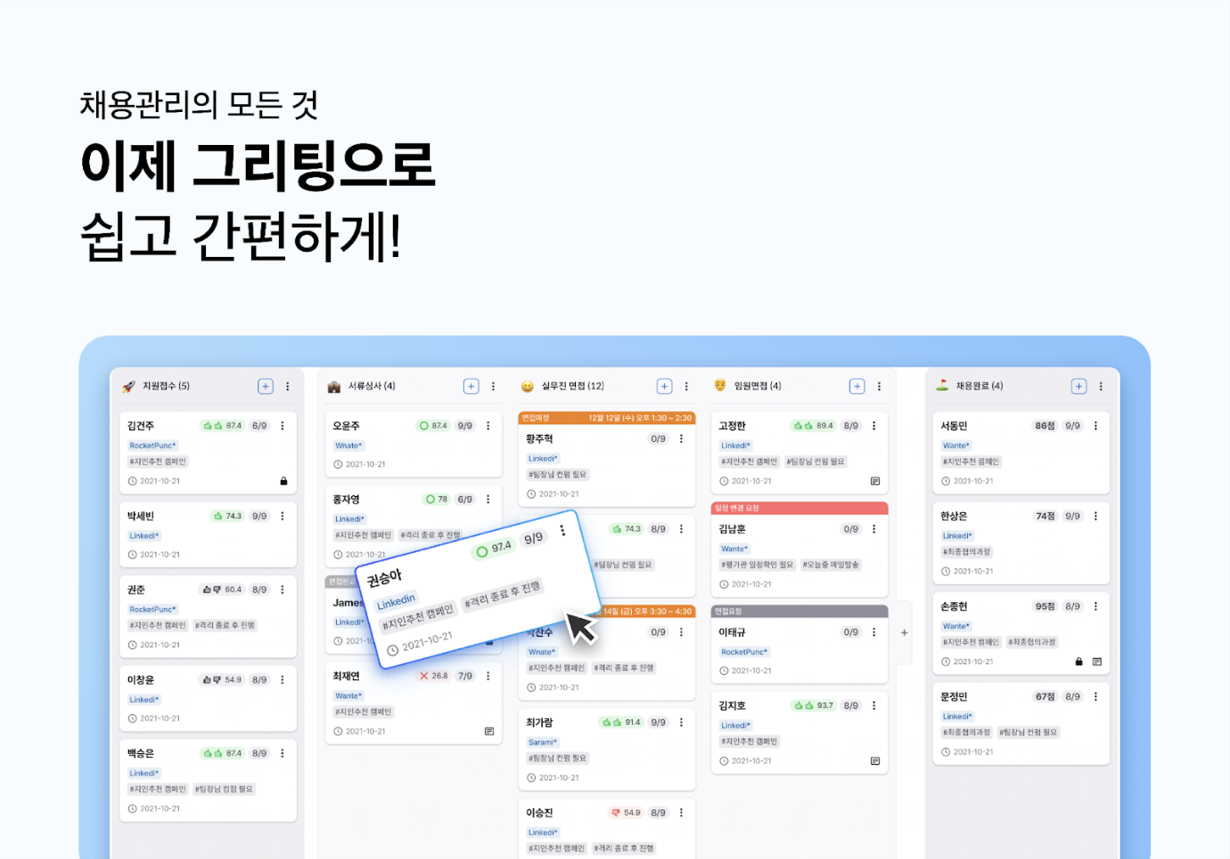 모 대기업 인사담당자는 “이력서가 모여드는 창구는 많은데 이를 관리할 수 있는 방안을 찾지 못해 고생했다. 이전에는 채용 프로세스도 길어지고 피드백을 전하지 못하는 경우도 발생했는데, 그리팅을 만나며 업무 효율이 크게 늘었고, 누락 없이 채용을 진행하는데 많은 도움을 받았다”고 전했다.