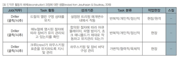 조금 더 구체적으로 살펴보자. 위에 언급한 기준을 토대로 직무 활동을 해체하는 작업을 선행한다는 것은 다음의 [표1]과 같이 직원들의 활동을 먼저 취합 조사하는 것을 의미한다. 굴착 및 시추 작업을 하는 드릴공을 예로 들어보자. 이 직무를 하는 사람의 활동은 여러가지가 있다(표1의 2열). 그리고 이러한 활동이 필요한 혹은 직무의 성과와 연결되는 기준이 별도로 있다(표1의 3열). 각 활동은 [그림 2]에서 살펴본 바와 같이 ‘반복적-변동적(가변적)’, ‘개인적-협력적’, ‘육체적-정신적’으로 구분해 볼 수 있다. 그리고 추가적으로 이러한 활동(task)이 현장에서 이뤄지는지 혹은 원격으로도 가능한지도 조사 가능하다. 표에는 삽입하지 않았지만 해당 활동(task)의 소요 시간이라든지, 또는 해당 직무에 특히 민감한 요인이 있다면 그러한 부분도 추가 변수로 하여 삽입할 수 있다.