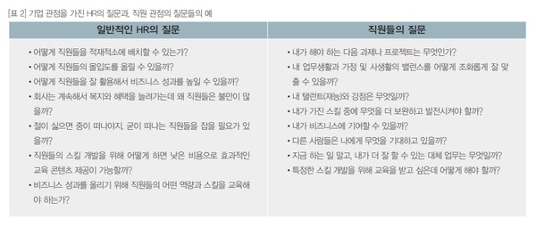 하단의 [표 2]는 기업 관점의 질문들과 직원 관점의 질문들을 예로 보여준다. HR은 언제나 적합한 사람을 적재적소에 활용하는 관점에 매몰되어 이러한 방식에 집중해 왔지만, 직원들은 결코 그런 질문을 하지 않는다. HR은 HR 관점의 질문이 아니라 직원들의 질문에 귀 기울이고 접근해야 한다. HR이 하는 질문은 관리와 운영을 용이하게 하기 위한 것이 아니라 직원의 필요와 니즈를 서비스하는 것들로, 그리고 이를 통해 비즈니스 가치를 창출하는 것들로 구성해야 한다.