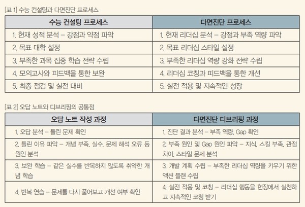 그렇다면 리더십을 어떻게 개발할 것인가? 그 답을 수능 컨설팅에서 찾아볼 수 있다. 대한민국의 무한경쟁 입시 지옥의 역사는 길다. ‘펜트 하우스’와 ‘일타 스캔들’이라는 드라마가 높은 시청률을 기록한 것도 이를 반증한다. 모 방송국은 유명한 ‘일타 강사’를 등장시켜 좋은 대학에 가기 위한 다양한 수능 컨설팅을 제시한다. 단순히 “공부를 열심히 하라”는 조언이 아니라, 현재 성적을 분석하고, 취약한 과목을 파악하고, 강점을 극대화하는 맞춤형 학습 전략을 제공한다. 웃픈 현실이지만 여기서 리더십 개발에 대한 인사이트를 찾을 수 있다. 우리는 흔히 “좋은 리더가 되려면 더 노력해야 한다”라는 막연한 조언을 듣는다. 하지만 공부와 마찬가지로, 효과적인 리더십 개발을 위해서는 정확한 진단과 맞춤형 전략이 필요하다. 이를 가능하게 하는 것이 바로 다면진단이다. 입시 컨설팅과 다면진단은 유사한 부분이 많다. 사례를 통해 살펴보자.