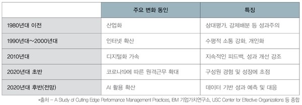 성과관리는 투입되는 자원에 비해 실제 성과 개선에 미치는 영향이 미미하다는 오명 하에 무용론이 수시로 대두되었으나, 폐지되는 대신 변화하는 산업 및 업무 여건에 따라 변모해왔다. 『Performance Appraisal and Management』의 저자인 케빈 머피 리머릭대 교수는 “성과평가가 사라진다기보단 전통적인 성과평가의 한계를 극복하고, 효과적인 성과관리 체계를 구축하는 방향으로 나아가고 있다”고 설명한다. 노동시장의 활력에 따라 성과관리에 대한 고용주와 구성원의 주도권이 달라졌고, 경쟁과 협업의 중요성에 따라 제도의 방향성이 정해졌다. 2010년대 이후 디지털화가 가속되면서 협업과 구성원 성장의 가치가 강조돼 왔다.