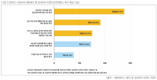 다만 AI 도입과 관련해 인사담당자는 이중고를 겪기 쉽다. 레몬베이스가 올초 발행한 ‘평가 및 성과관리 트렌드 2025’에서도 짚었듯이, 인사담당자는 AI에 대해 HR 업무에의 도입뿐 아니라, 구성원의 ‘AI 리터러시’도 고려해야 하기 때문이다. AI 리터러시는 AI 기술을 이해하고 사용하는 능력은 물론, 조직과 개인에 미치는 영향을 비판적으로 평가할 수 있는 능력을 포괄하는 개념이다. 레몬베이스가 2024년 12월 6일부터 18일까지 인사담당자 398명을 대상으로 진행한 설문조사(복수 응답)에서 ‘성과관리 트렌드 중 시급하게 대응해야 한다고 생각하는 변화’로 △HR 업무 자동화를 통한 효율성 증대에 초점을 맞춘 AI 활용 확대를 꼽은 응답자가 127명, △구성원 대상 AI 리터러시 교육 필요성 증가를 선택한 응답자가 73명에 달했다.
